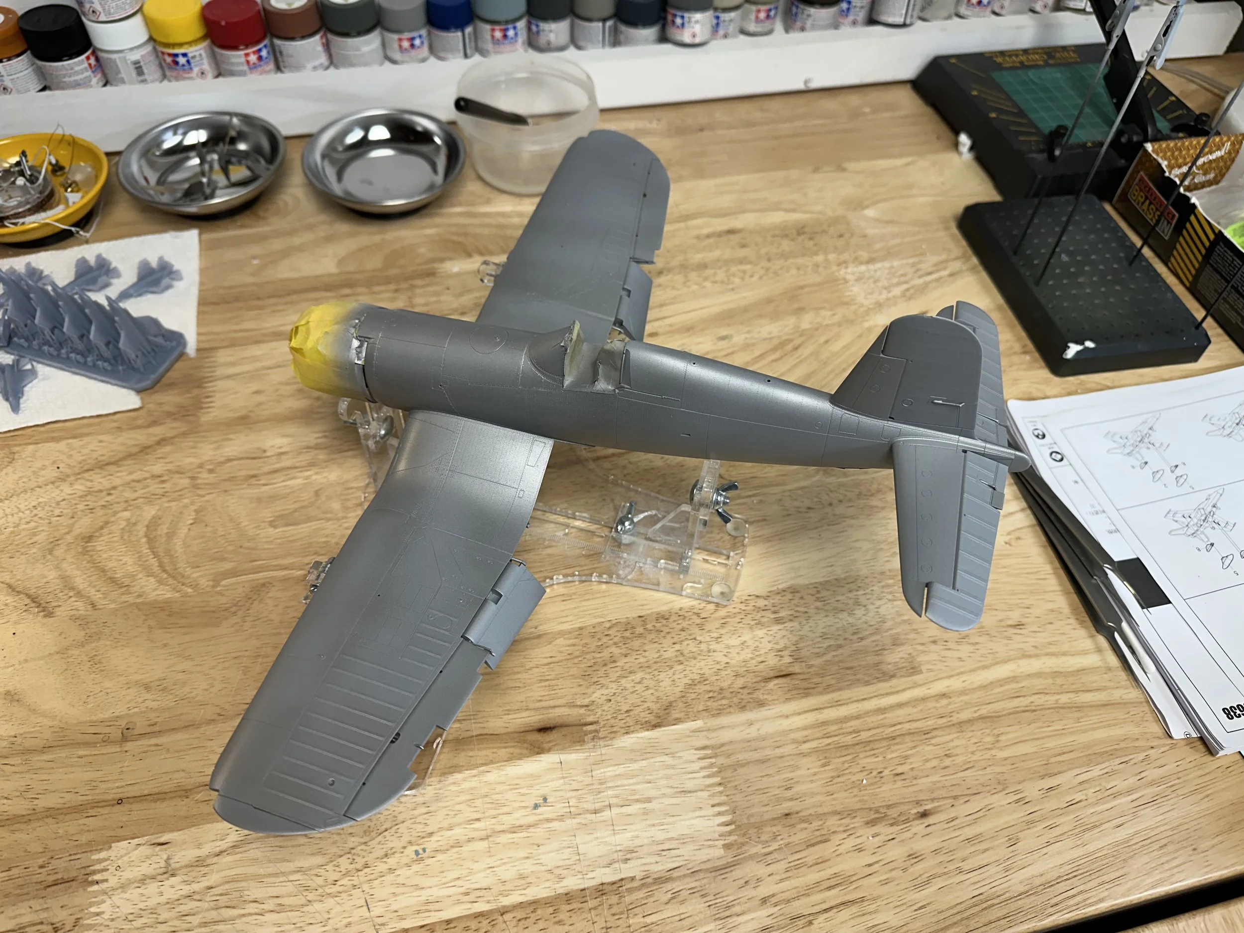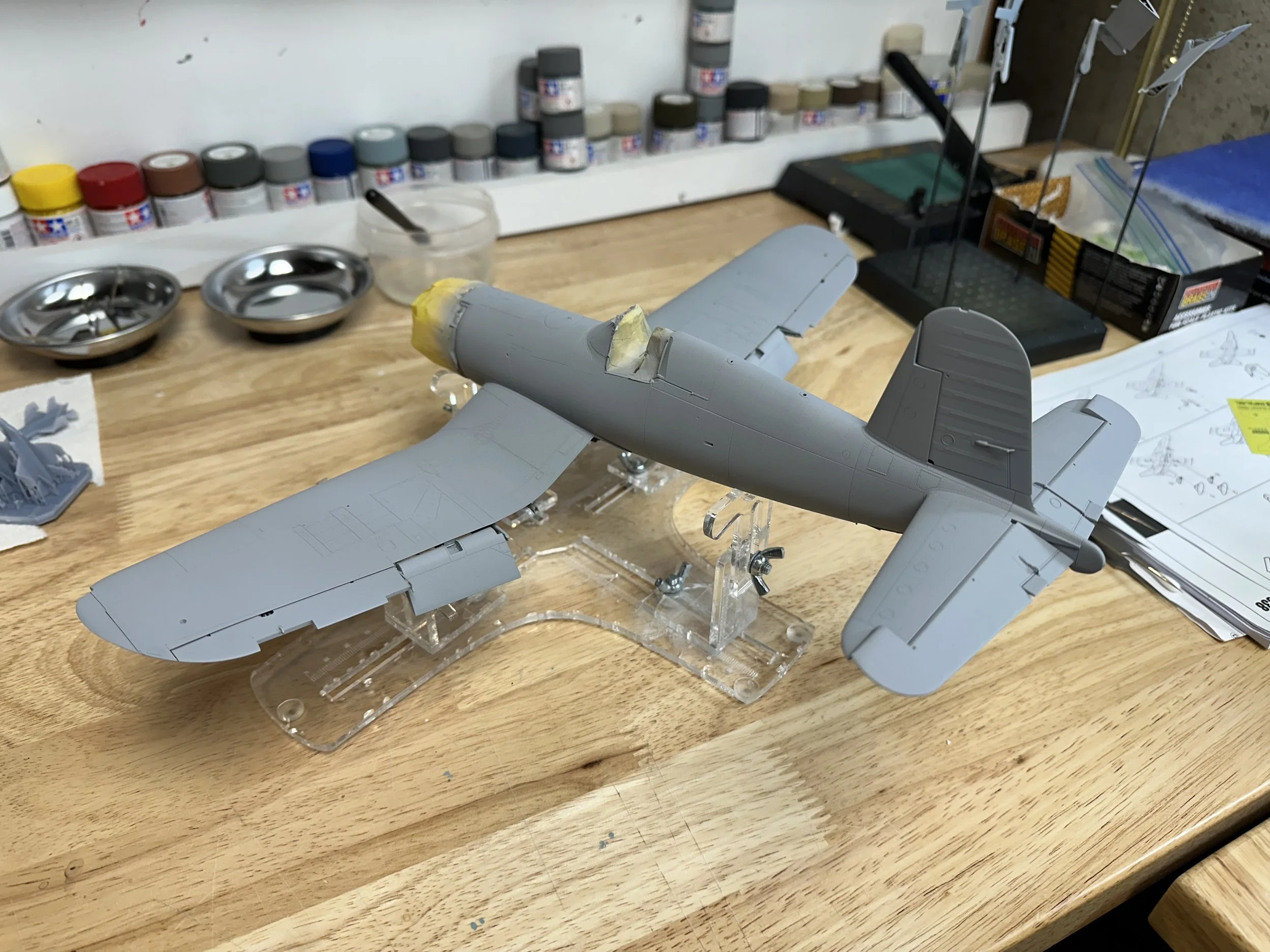As I wait for decals I produced to be printed by a third party vendor (for the Enterprise CVN-80), I decided to shift focus back to the 1/32 Tamiya F4U-1D Corsair. With much of the aircraft built, the next stage is painting.